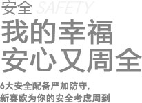 安全安全籠式車身、井字鋼梁、潰縮空間設計 4輪29次安全碰撞測試,以國際安全標準呵護您的旅程 ABS+EBD、五座標準安全帶(前排帶預張緊功能) 全系標配雙安全氣囊、安全碰撞可潰縮吸能轉向柱 后排車門兒童安全鎖和后排IS0FIX兒童安全座椅固定裝置 行人保護安全車頭雙翼區