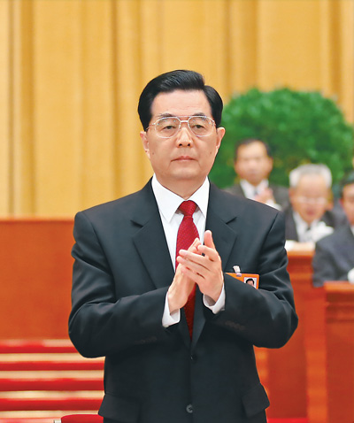 習近平表示,胡錦濤同志擔任國家主席10年間,以豐富的政治智慧、高超的領導才能、勤勉的工作精神,為堅持和發展中國特色社會主義建立了卓越的功勛,贏得了全國各族人民衷心愛戴和國際社會普遍贊譽。在習近平的提議下,全場以熱烈掌聲,向胡錦濤表示衷心的感謝和崇高的敬意。