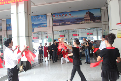 10月10日上午,蓮都區創衛宣傳隊走進客運西站,在候車室用他們自己編排的創衛節目向西站員工和過往旅客進行“創國衛”的宣傳。 宣傳隊員認真的表演,引來不少乘客駐足觀看。