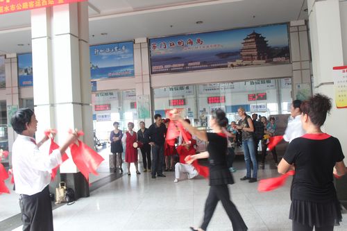 10月10日上午,蓮都區創衛宣傳隊走進客運西站,在候車室用他們自己編排的創衛宣傳小節目向西站員工和過往的旅客進行創國衛的宣傳。 節目的內容有腰鼓、三句半、快板等,宣傳隊員認真的表演,引來不少乘車旅客駐足觀看。通過這樣的宣傳活動,將創衛受益你我他這個理念傳遞給大家,同時營造人人關心創衛,支持創衛的良好氛圍。