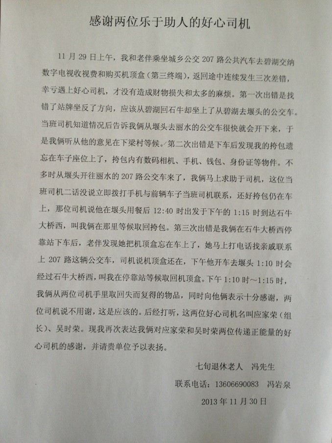經了解,11月29日上午,市民馮先生和他老伴乘坐207路公交車去碧湖繳納數字電視收視費和購買機頂盒,在往返途中連續發生三次差錯,幸好遇上好心司機,才沒有造成財物損失和太多的麻煩。第一次出錯是找錯了站牌坐反方向。兩位老人繳費和購買機頂盒后,應該從碧湖回石牛,但卻坐上了碧湖去堰頭的公交車。當班司機知道情況后,及時將車停靠,并詳細告訴老人從堰頭去麗水的公交車很快就會開來,告訴他們應該哪里下車,于是兩位老人在下梁村等候。第二次出錯是下車后,馮巖泉發現下車地點對了,但挎包遺忘在車子座位上了,挎包內有數碼照相機、手機、錢包、身份證等物件。沒多久從堰頭開往麗水的K207路公交車來了,馮巖泉馬上向司機求助,這位當班司機立即撥手機與前輛當班司機聯系,還好挎包仍在車上,司機說他在堰頭用餐后12點40分出發,于下午的1點15分到達石牛大橋西,叫老人在那里等候取回挎包。第三次出錯是在石牛大橋西??空鞠萝嚭螅T巖泉老伴發現她把機頂盒忘在車上了。老人通過親戚打電話聯系上了他們剛才乘坐的公交車,司機說機頂盒還在,下午他開車去堰頭1點10分會經過石牛大橋西,叫老人在??空镜群蛉』亍O挛?點10分-15分,馮巖泉分別從兩位司機手里取回了失而復得的挎包和機頂盒,同時向他倆表示十分感謝,并再三詢問駕駛員姓名,想通過媒體進行表揚一下。而這兩位司機都笑笑說:“這是件非常普通的事,誰遇到這種事都會這么做的”。