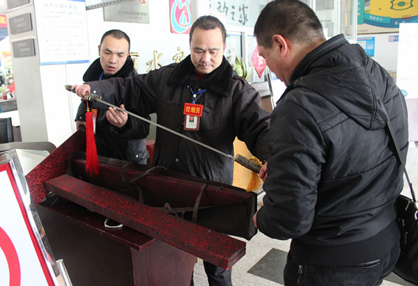 西站安檢崗位潘峰、金翔、鐘韶華值班三位同志在值班。今天客流量大,是平時的一倍左右,安檢員們工作也都比往常更認真仔細了。80:50分左右,鐘韶華、金翔發現一名男子提著三盒包裝精美的禮盒經過安檢。鐘韶華忙禮貌上前將該男子叫到一邊,讓他開包檢查。經檢查,三盒均為龍泉寶劍,其中兩把寶劍未開封可攜帶,一把寶劍已開封不能攜帶上車,按規定對這把寶劍進行了登記暫扣處理。該男子也很配合安檢員的工作,直夸安檢員們工作認真細致。