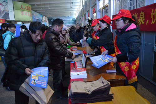 為進一步建設平安蓮都,共創和諧社會,2月13日上午,東站借春運來往旅客多、宣傳效果廣泛的契機,聯合巖泉街道在東站候車廳內向廣大旅客宣傳“珍愛生命,遠離毒品”。社區禁毒干事趙素珍女士和東站春運志愿者服務隊的隊員們,向廣大旅客、車主和職工發放了禁毒宣傳資料手冊、青少年禁毒漫畫等禁毒宣傳資料;同時還給現場的旅客耐心講解了毒品的危害。通過此次宣傳活動,使廣大旅客進一步認清毒品的危害,增強自我保護的意識,自覺抵制和遠離毒品。