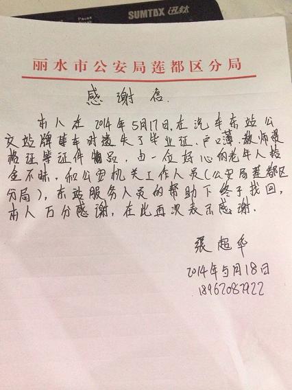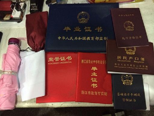 東站服務臺的楊大姐翻看了袋中物品,是一本本各式各樣的證書,總共有六本,主人名叫張超華。楊大姐心想:“這么多的證書丟了一定非常著急,有些逗還補不回來呢”。于是,她通過戶口簿上的信息,在東站派出所的幫助下找到失主。而失主也早已報了警,在派出所留下了手機號碼。