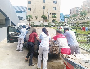 洪水突襲市區后,售后接待電話就接連不斷,傳來的都是客戶急切救援的聲音。為更快速的開展救援工作,20日下午,夏偉強經理親自帶領施救組在一線實地指揮搶險救災;經理助理金虹則帶領銷售團隊分組分頭沿著水路挨家挨戶上門咨詢、了解車輛受災情況,以便施救車輛更快的實施施救工作;經理助理呂佩軍在現場與售后師傅們現場轉移車輛,推、拉、移所有的招式都用上了。渾濁的污水都沒過了大腿,他們都無所畏忌。