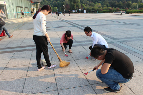 鏟刀、清潔刷、掃把、水管……清潔工具一一分配到手中之后,大家便熱火朝天的干起來。雖已入秋,但午后的太陽依然刺眼,沒一會兒,大家都開始冒汗,但誰也沒停下手中的勞動,依舊頂著太陽蹲在地上鏟口香糖或是奮力地洗刷地面。