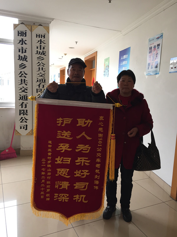 2月23日,麗水市城鄉公交公司的辦公室來了一對樸實的夫婦,他們拿著一面印有“護送孕婦恩情深,助人為樂好司機”字樣的錦旗,指明要送給501路公交車司機劉海偉:“多虧了劉師傅幫忙,我兒媳婦才平安生下了大胖小子!”